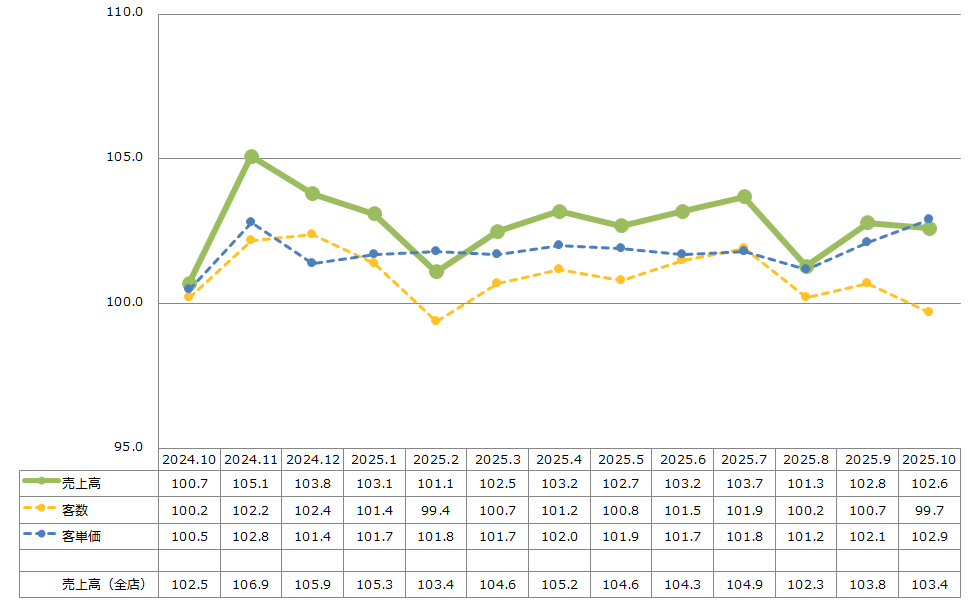 既存店売上高は前年同月比102.6%。32カ月連続で前年同月比をクリアしている。客数は昨対99.7%も、客単価102.9%でカバーした。