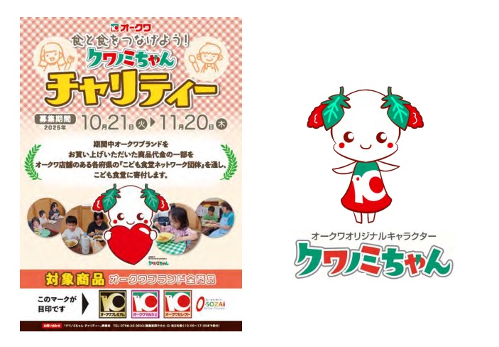 (株)オークワ(和歌山県和歌山市、大桑弘嗣社長)は10月21日(火)から1カ月間、オークワのオリジナル商品を購入すると商品代金の一部をこども食堂ネットワーク団体に寄付をする「クワノミちゃんチャリティー」キャンペーンを全店で実施する。