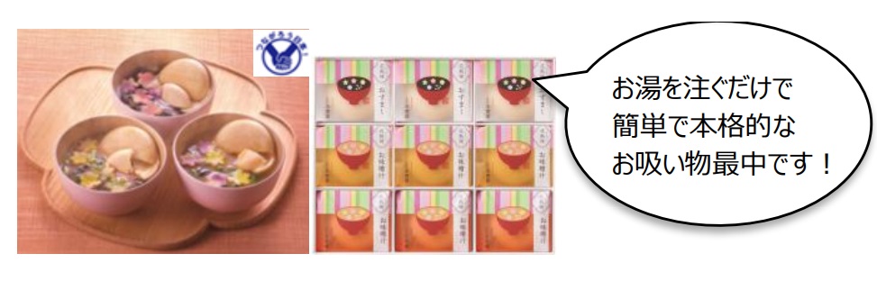 お味噌汁、おすまし、お味噌汁田舎みそ各3個入りで3200円。