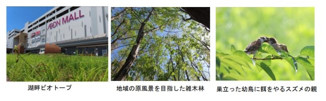 イオンモール草津では、地域に自生する在来種の苗木を用いた「イオン ふるさとの森」の保全をはじめ、琵琶湖岸の湿生草原をモデルとした湖畔ビオトープの設置、絶滅危惧種による原風景の再現など、自然との共生を目指したモールづくりを推進してきた。