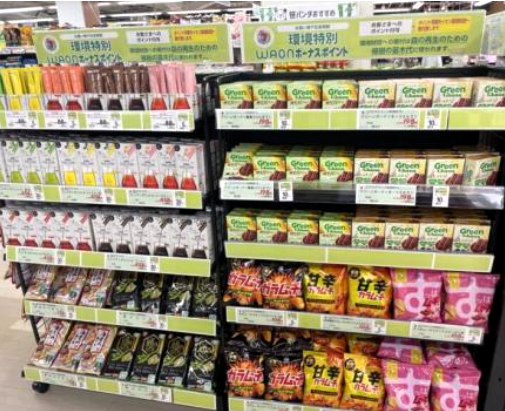 「環境特別WAONボーナスポイント」は、期間中に対象の環境配慮型商品を購入するとお客に付与されるWAONボーナスポイントと同額が、環境保全活動に役立てられる取り組み。九州内の「イオン」「イオンスタイル」「マックスバリュ」「マックスバリュエクスプレス」「ザ・ビッグ」「ホームワイド」で、2022年から実施している。