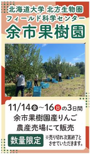 イオン北海道(株)(札幌市白石区、青栁英樹社長)は、国立大学法人北海道大学(寳金清博総長)の北方生物圏フィールド科学センター 生物生産研究農場 余市果樹園で収穫されたりんご(ニュージョナゴールド・ひめかみ・ふじ・陽光・紅将軍・王林)を販売する。イオン札幌桑園店で11月14日(金)からの3日間、期間限定で取り扱う。