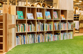 「無印良品 イオンモール橿原」の「Open MUJI」は、世界最大の売場面積を誇る店舗の中央に配置された「地域に開かれた憩いの広場」。子どもだけでなく、その家族や地域の人々が集い、思い思いの時間を過ごすことができるように、さまざまな「居場所」を設えた。ここで使われている床材や柱化粧材から家具、什器、玩具、楽器にいたるまで、この地域の資源である吉野杉や吉野檜をふんだんに使用している。広場での遊びを通して、地域産材に包まれた空間を体験する貴重な体験ができる。無垢材でつくられた本棚には、新品・中古品あわせて1万冊の児童書を配置している。