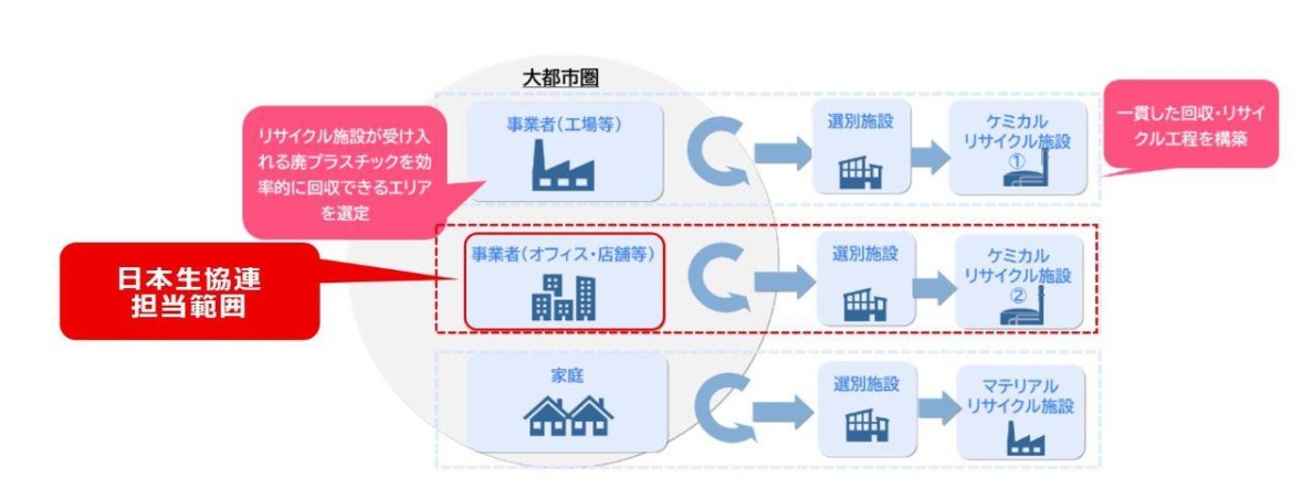 日本生協連は、大都市圏での実証に参画し、本部ビル(コーププラザ)から排出されるプラスチック廃棄物を提供する。他事業者からの提供分とあわせて近赤外線光学選別を行い、ケミカルリサイクルに適した素材(ポリオレフィン樹脂など)を抽出する。抽出されたプラスチック廃棄物は加工処理のうえ油化ケミカルリサイクルの実証を行う。