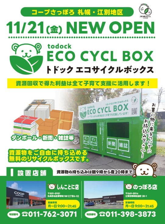 生活協同組合コープさっぽろ(札幌市西区、大見英明理事長)は11月21日(金)から、札幌地区の「しんことに店(北区)」と「のっぽろ店(江別市)」の2店舗に古紙類を回収する「トドックエコサイクルボックス」を設置する。これにより、道内19店舗に設置することとなる。