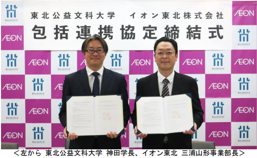 イオン東北(株)(秋田県秋田市、辻雅信社長)は11月19日(水)、山形県酒田市にある東北公益文科大学と包括連携協定を締結した。相互に緊密な連携と協力を図り、地域における持続可能な社会の発展に寄与することを目的としている。
