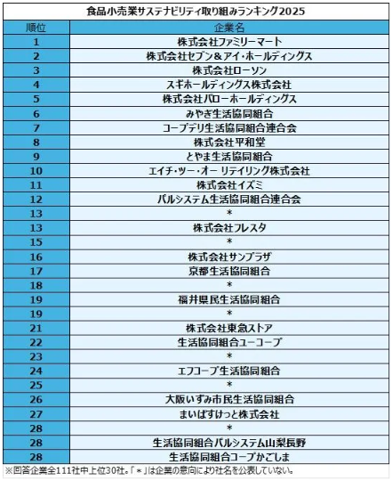 取り組みランキング1位はファミリーマート、2位がセブン&アイホールディングスとなった。ランキングは、サステナビリティ推進の方針策定・体制整備や取り組み、持続可能な調達、環境・気候変動対策、食品ロス削減とリサイクル向上、持続可能性に配慮した商品、物流など139問の設問に対する合計得点で評価される。