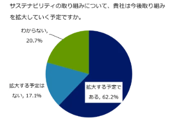 今年度の調査で最も特徴的だった回答として、サステナビリティ推進の最大課題に「専門知識を備えた人材がいない・育っていない」が約6割(58.6%)と最も多く挙げられた点。この傾向は「多忙」(43.2%)や「予算不足」(38.7%)を上回り、専門人材の不足が施策の継続性・体系化を妨げる大きな要因となっていることを示している。