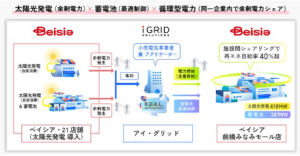 ベイシアでは、2025年11月時点でアイ・グリッドと連携した太陽光発電設備を46店舗で導入しており(そのうち5施設は蓄電池併設)、その中の21店舗では余剰電力を創出している。