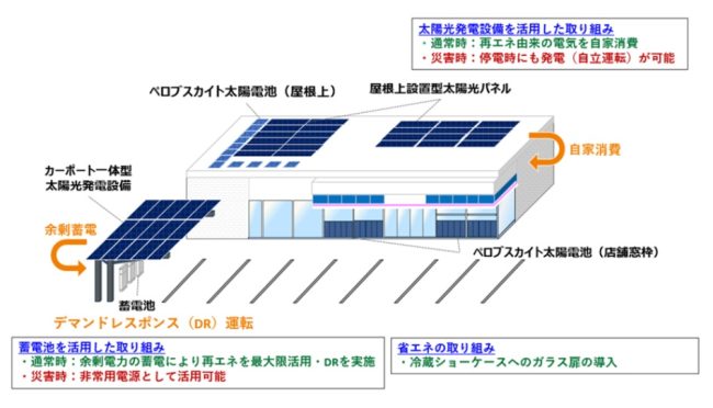このほか、冷蔵・冷凍ショーケースにガラス扉およびアクリル扉を取付け、消費電力量を削減することで、同店舗の年間消費電力量の14%程度を再エネ由来の電力で賄うとともに、省エネによる消費電力量とCO2排出量の削減を目指す。