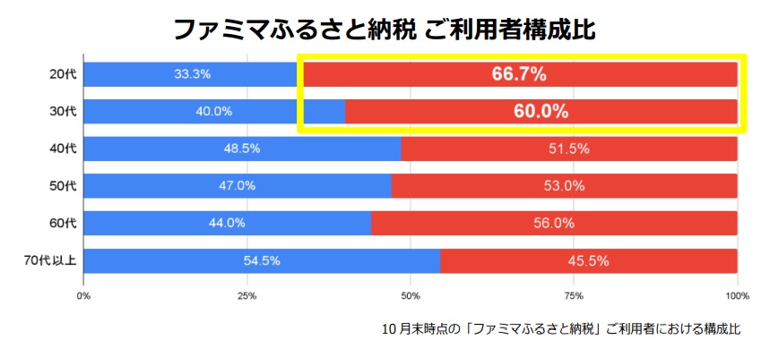 利用者の構成では、ファミペイ会員の構成が全年代で男女半々であるのに対し、「ファミマふるさと納税」の利用者は20代・30代の女性が高い比率を占めている。これは、仕事やプライベートで忙しい人にとって、日々利用するコンビニが活用できること、さらに1000円から寄附が可能なため、寄附控除枠をムダなく使い切りたいというニーズにも合っていると考えられる。