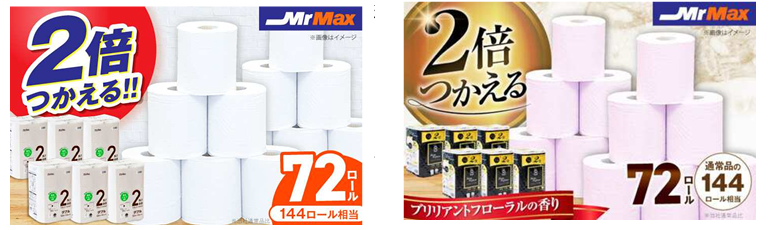 返礼品は「MrMax2倍巻きトイレットペーパー 再生紙72ロールダブル」と「MrMax2倍巻きトイレットペーパー ルシアパフューム72ロールダブル」。両品ともに72 ロールで通常品の144 ロールの長さがあり、取り替え回数、ストックスペースが従来の半分で済む。