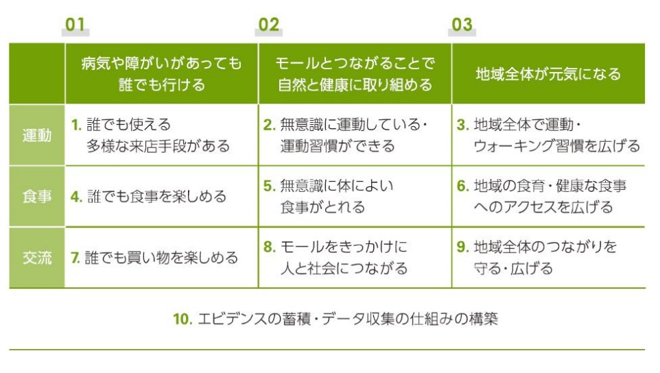 内容は、イオンモールのヘルス&ウエルネスプラットフォームの方針(下図)に基づいて、運動・食事・交流に関する実証を行う。