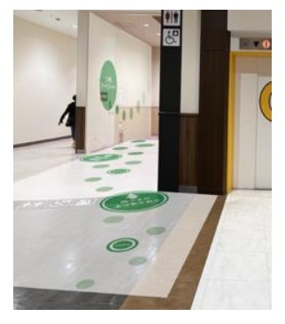 イオンモールウォーキングの一環で、階段利用を促し利用者の身体活動量を高めるため、階段までのルートや階段エリア内に、階段を上りたくなるデザイン・メッセージを施工する。