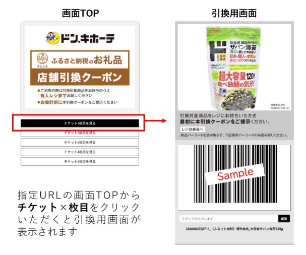 「ドンキふるさとクーポン」は、電子クーポン1枚につき1商品と引き換えられる回数券タイプのお礼品で、商品ごとに必要なクーポン枚数を選べる。クーポンを受け取った日から 120日間の有効期限内であれば、好きなタイミングで全国のドン・キホーテ系列店舗(一部店舗を除く)で対象商品と交換