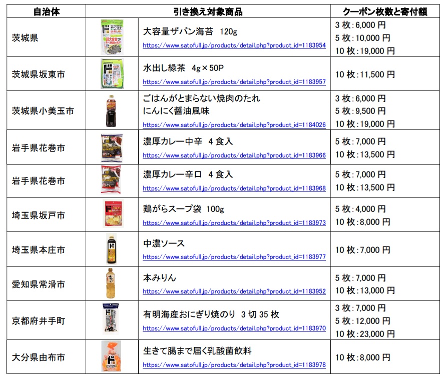どれも生産工場を有する自治体がお礼品として提供するもので、4000円から寄付が可能となる。今後は食品以外にも対象商品を拡大していく。