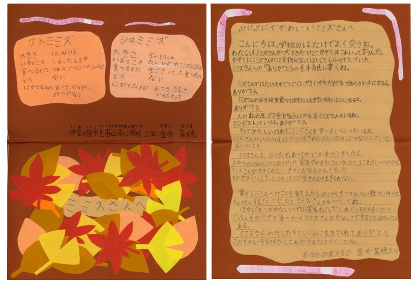 文部科学大臣賞は、各ブロックから選ばれた最優秀作品賞の中から、伊豆の国市立韮山南小学校2年生の金井菜穂さんの作品「ミミズさんへ」に決定した。