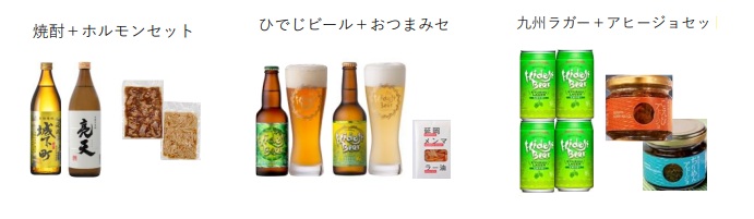 「焼酎+ホルモンセット」寄付金額2万円、「ひでじビール+おつまみセット」寄付金額1万4000円、「九州ラガー+アヒージョセット」寄付金額1万5000円など。