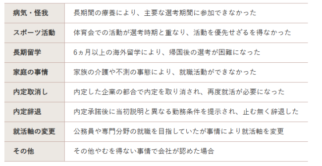 対象となるのは、特別な事情(下表参照)により就職活動の期間を逃した2026年3月卒業見込みの大学生・短期大学生・専門学校生、および既卒3年以内の人。職務を継続的に支障なく遂行できる健康状態にあることが応募資格となっている。やむを得ない外部要因により機会を逸した学生を支援するための特別枠であるため、通常の就職活動ができていた方は対象外。