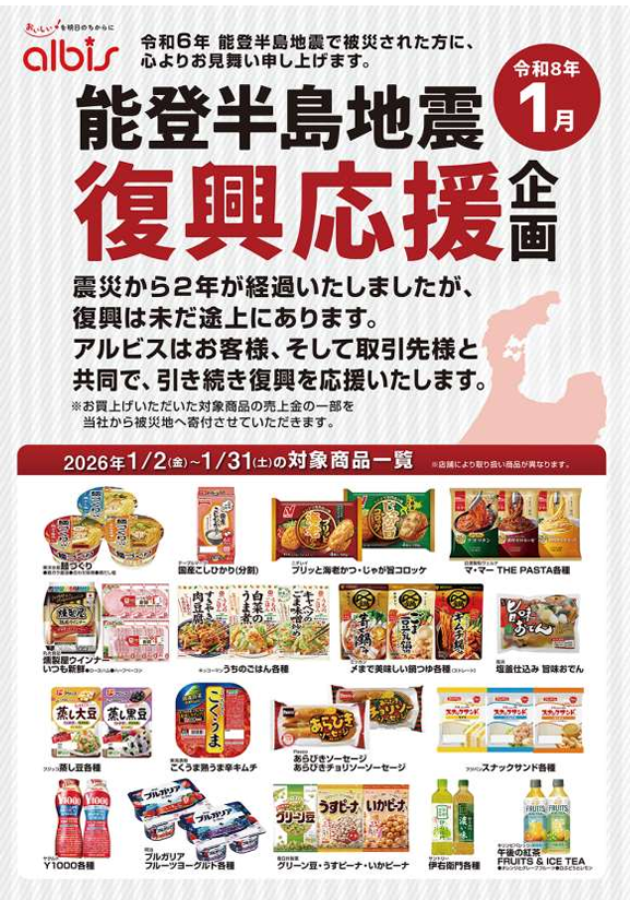 流通スーパーニュース > CSR > アルビスnews|26年も「能登半島地震復興応援企画」実施、売上金の一部寄贈 アルビスnews|26年も「能登半島地震復興応援企画」実施、売上金の一部寄贈 CSR / 2026年01月05日 ツイート 2024年1月発生の能登半島地震から2年が経過。被災地ではインフラの復旧は進んでいるものの、本格的な住宅再建、被災者の生活再建など多くの課題が残っている。 アルビス(株)(富山県射水市、池田和男社長)では2024年4月から対象商品の売上金の一部を寄付する「能登半島地震復興応援企画」を全店で実施してきた。企画継続の要望が多いことから、2026年1月以降もこの応援企画を継続して実施する。 ツイート