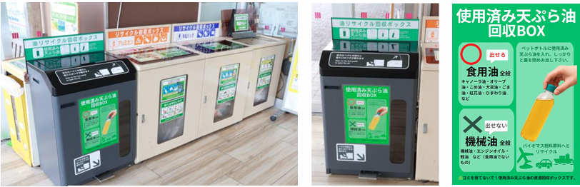イオン琉球では家庭から排出される食用油を店頭で回収する。拐取された油は、再生されたバイオディーゼル燃料(BDF)としてトラックなどで利用される。軽油の代替燃料としてBDFを使用すると、1キロリットル当たり2.62t-CO₂のCO₂削減につながる。この取り組みで、1店舗当たり月間200リットルの回収を目標とする。年間約1万9200リットル回収すれば、約50トンものCO₂排出量削減効果が見込まれるという。