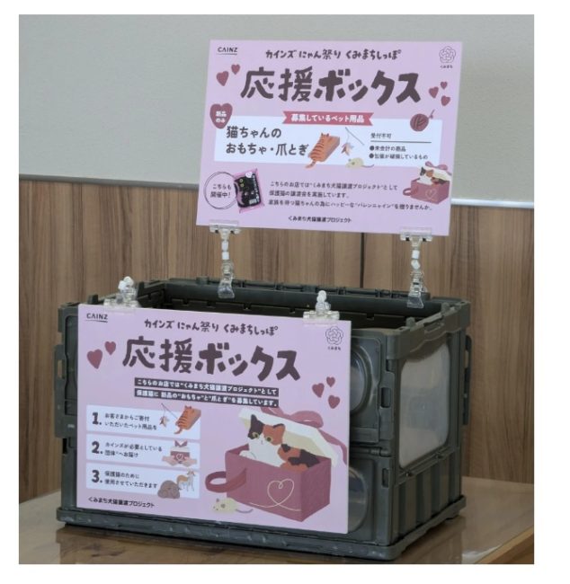 また「にゃん祭り」開催期間中は、保護猫譲渡会を実施するカインズ店舗で、自治体と協力する保護団体への物資支援を目的とする「くみまちしっぽ応援ボックス」を設置する。今回は、2月14日の「バレンタインデー」をモチーフに、家族との出逢いを待つねこちゃんたちへハッピーな贈り物をする「バレンニャイン」と題し、新品のおもちゃ・爪とぎの寄付を募集する。