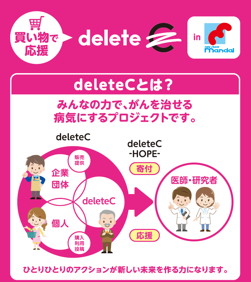 (株)万代(大阪府東大阪市、阿部秀行社長)は2月1日~2月27日の約1カ月間、スーパーマーケット万代全170店舗で、買物でがん治療研究を応援する「deleteC」の取り組みを実施する。