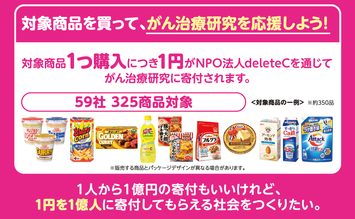 「deleteC」は、ふだんの暮らしの中でがん治療研究を応援できる社会貢献活動。運営するdeleteCは、2019年に設立され、2022年に認定NPO法人となった。プロジェクトに参加する企業・団体が自身のブランドロゴや商品、またはサービス名からCancerの頭文字の「C」の文字を消したり、deleteCのロゴやコンセプトカラーを使ったりするなどして、オリジナル商品・サービスを企画・提供する。そして購入金額の一部はdeleteCを通じて、医師・研究者が推進するがん治療研究に寄付される。
