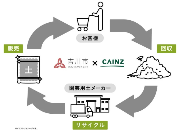 カインズでは、家庭で不用になった園芸用土をカインズ店舗で回収し、園芸用土メーカーで焼成・殺菌処理を行った上で、「循環型培養土」として再生し、カインズ店舗にて販売する「園芸用土の水平リサイクルシステム」を進めている。2023年に京都府亀岡市で開始し、現在は全国9店舗で取り組んでいる。