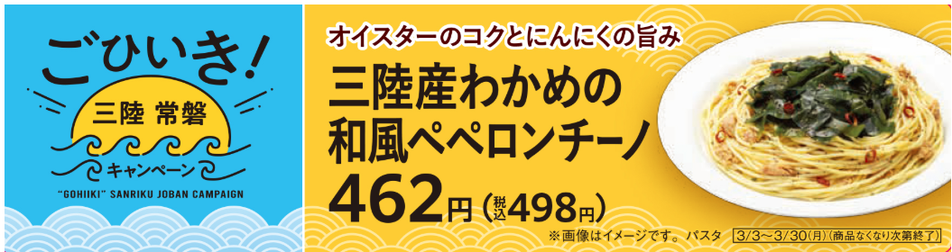 またファミリーマートでは3月3日(火)から、三陸・常磐の海の幸を使用した商品を、全国のファミリーマート約1万6400店で順次展開する。「三陸産わかめの和風ペペロンチーノ」「相馬産あおさの塩ラーメン」「ワンタンと三陸産めかぶの中華風春雨スープ」「紀州南高梅の梅酢仕立て 三陸産茎わかめ」の7品目だ。