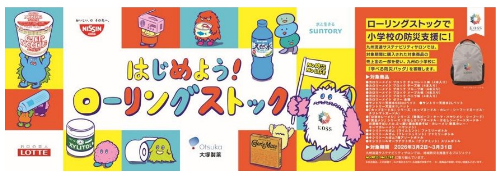 日常生活の中で備蓄する「ローリングストック」を普及させるため、大塚製薬(株)、サントリーフーズ(株)、日清食品(株)、(株)ロッテの対象商品をはじめとする防災関連商品の展開や、共通ビジュアルを用いた啓発活動を行う。対象店舗は九州地区のゆめタウン・ゆめマート全店。