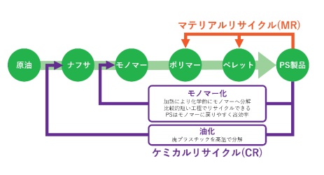使用済みポリスチレン(PS)はリサイクルに適したプラスチックのひとつであり、マテリアルリサイクル(MR)や各種CR(油化およびモノマー化)への適性が高いことが特長だ。CRは化学的な分解・精製工程を経ることなどでバージン(再生でない、新品)材と同等の品質を実現できるため、高い品質と安全性が求められる食品容器包装などへの利用に適している。また、PSはCRの中でも比較的短い工程で高効率に再生できる「モノマー化」が適用可能となる。