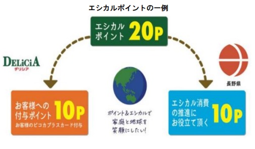 デリシア、ユーパレットなどのデリシア店舗において、デリシアポイントの「ピコカプラスカード」を提示して「エシカルポイント」対象商品を購入すると、ポイントが付与される。そして、そのポイント同等額が「エシカル消費」推進のために長野県に寄付される。