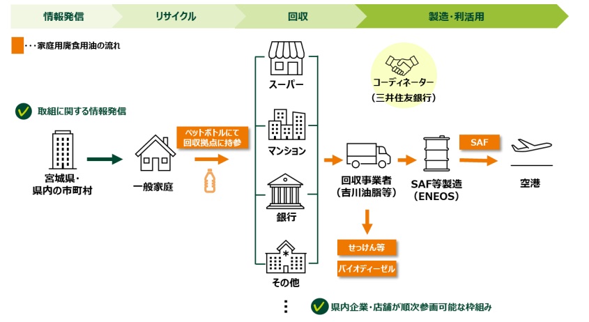 回収した廃食用油は、SAF(持続可能な航空燃料)などのバイオ燃料の製造に活用することを見据えて再資源化を進め、将来的には、回収した油を原料としてENEOSがSAFを製造することを目指す。