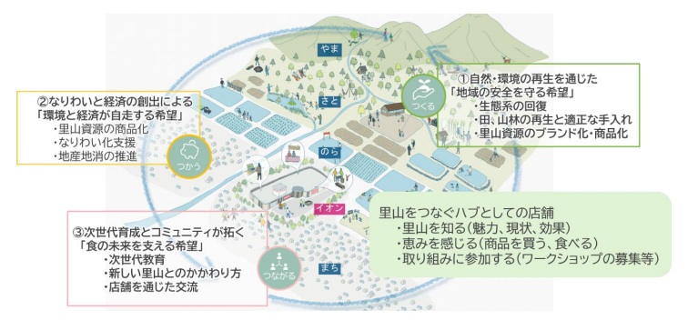 イオンは、地域とともに事業を進める企業として、地域課題の解決に継続的に取り組み、自然を単に守るだけでなく活かしながら、地域の生業やコミュニティの再生につなげ、持続可能な地域モデルの構築を目指して「イオンの里山プロジェクト」を推進する。