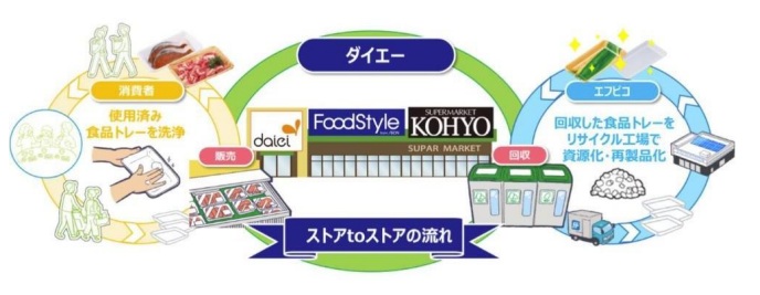 ダイエーは、店舗で使用済み食品トレーを回収し、エフピコでリサイクルして「エコトレー」などに再生。それらを再び売場で使用することで、回収する「お店」とエコ製品が並ぶ「お店」が循環的につながる水平リサイクル「ストア to ストア」を推進している。