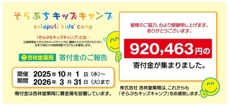 杏林堂薬局news|「そらぷちキッズキャンプ」に92万0463円を寄付