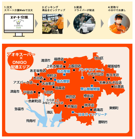 アオキスーパーは、2023年から ONIGO(株)が展開する即時配達サービス「Qコマース」を導入。現在、名古屋市内全16区に加え、津島市、清須市、大治町、あま市、蟹江町、瀬戸市、豊明市、春日井市、尾張旭市、長久手市、日進市にまで配達エリアを拡大している。