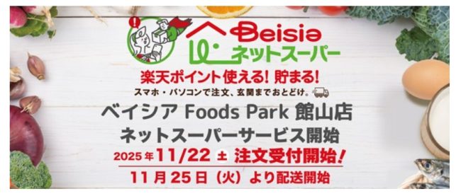 (株)ベイシア(群馬県前橋市、相木孝仁社長)は、今月オープンした「ベイシア Foods Park 館山店」で「ベイシアネットスーパー」の配送サービスを11月25日(火)から開始した。