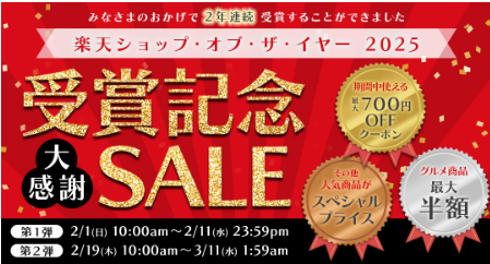 ベイシアは受賞記念として、2月1日(日)からベイシア楽天市場店で「楽天ショップ・オブ・ザ・イヤー2025 受賞記念SALE」を開催している。人気商品の特価セールや、ベイシア楽天市場店で取り扱う全商品に使用できる最大700円引きのクーポンを発行する。