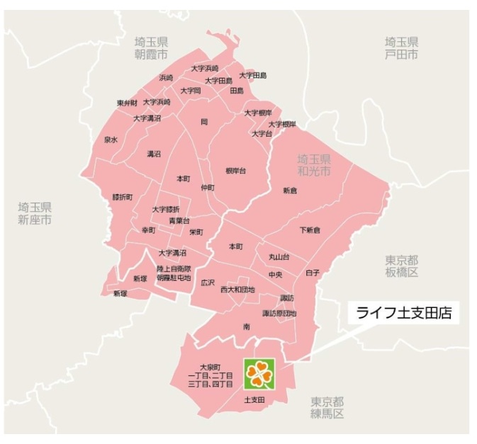 「ライフ土支田店」の配送エリアは東京都練馬区の一部と埼玉県和光市・朝霞市・新座市の一部。