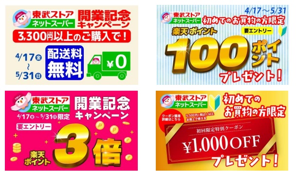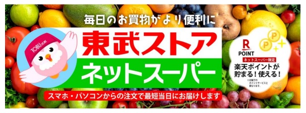 また東武ストアネットスーパー開業記念として、3300円以上の購入で送料無料や、初めて利用・購入した人限定で楽天ポイントを100ポイントプレゼントするなどの各種キャンペーンを実施する。