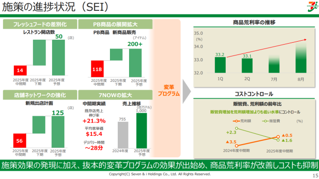7-Eleven International LLCは、各市場の特性に合わせた「食のコンビニ」への転換を進めている。中間連結会計期間の営業利益(のれん償却前)は104億2400万円(112.3%増)。なお、2024年度に子会社となった7-Eleven Australia(オーストラリア)においては、タバコ販売規制強化による売上げへの影響が出たが、フレッシュフードの商品開発強化と品揃えの拡大により客数が増加し既存店売上げは前年を上回った。