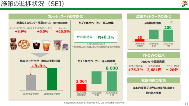 (株)セブン-イレブン・ジャパンは、2025年5月から新体制の下で「フレッシュフードの差別化」、「店舗ネットワークの強化」、「7NOWのお客様価値最大化」、「お客様とのエンゲージメント強化」を重点施策としている。一例として、出来立て商品の「セブンカフェベーカリー」や「セブンカフェティー」の全国展開を、新たな店舗形態の拡充を通じて図っている。