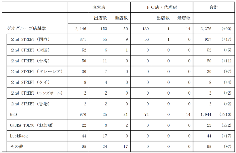リユース系リユース商材は、売上高1539億4200万円(9.7%増)。2nd STREETにおける主力商材の衣料・服飾雑貨が好調に推移した。気温の変化に合わせたタイムリーな商材展開と、国内及び海外での積極的なドミナント出店が奏功し、リユース市場における高いシェアを背景に、引き続き高い成長を実現している。 リユースラグジュアリー商材を扱うOKURA TOKYOは、インバウンド需要が落ち着いたこともあり、調整局面が継続している。