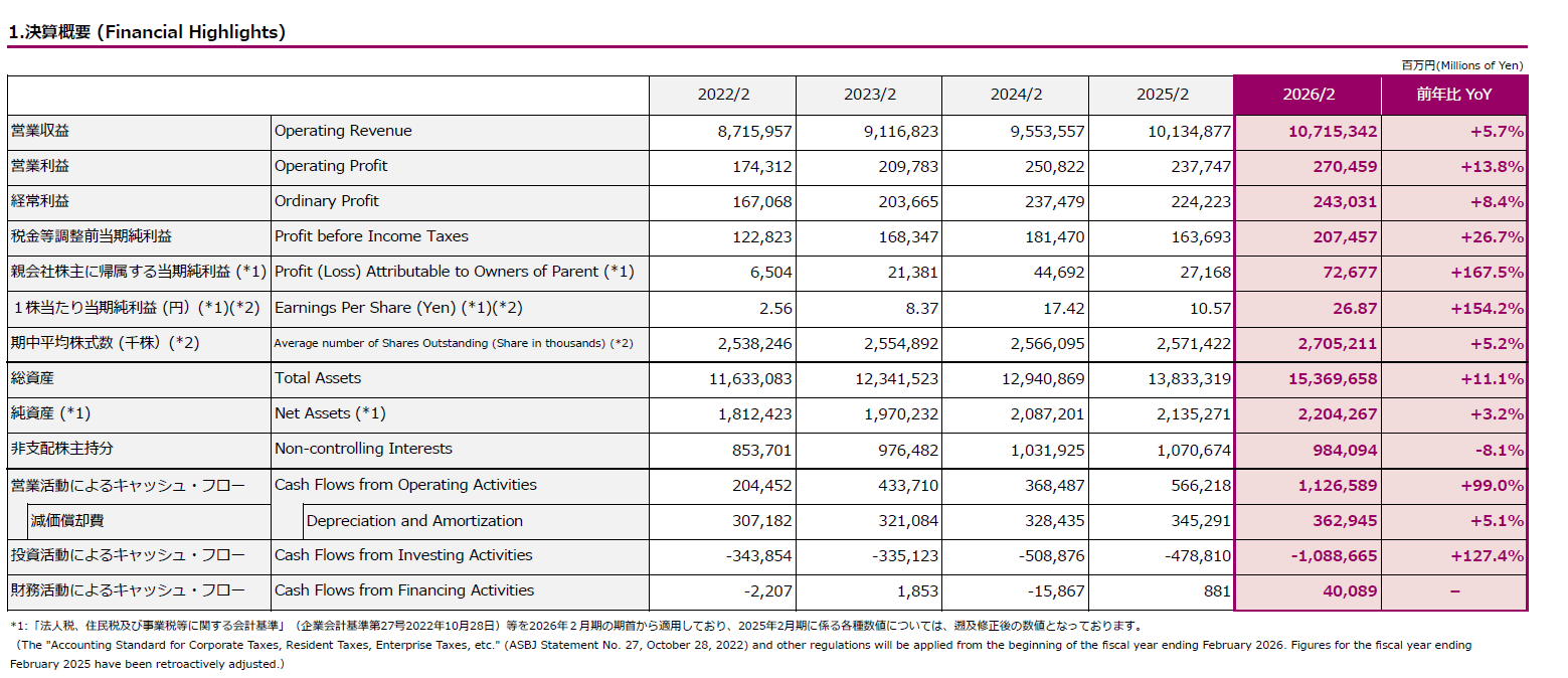 イオン(株)(千葉市美浜区、吉田昭夫社長)は2026年2月期決算は営業収益10兆7153億4200万円(対前期比5.7%増)、営業利益2704億5900万円(13.8増)、経常利益2430億3100万円(8.4%増)となり、営業収益と営業利益、経常利益が過去最高を更新した。当期純利益は726億7700万円(26.7%増)。