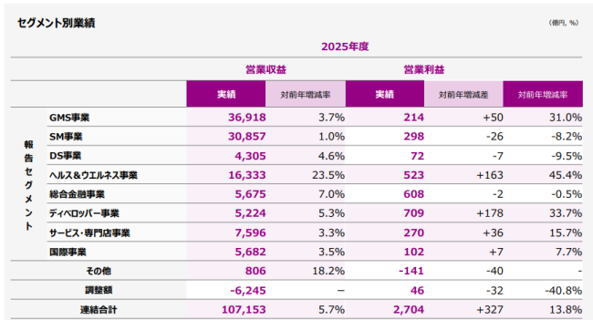 ヘルス&ウエルネス事業は、営業収益1兆6333億1800万円(23.5%増)、営業利益523億6800万円(前期より163億6100万円の増益)となった。ウエルシアを完全子会社とする株式交換が2025年12月に完了し、経営統合が実現したツルハは、営業収益1兆4505億8500万円、営業利益630億3700万円となった。総合金融事業は、営業収益5675億4400万円(7.0%増)、営業利益608億7100万円(前期より2億9300万円の減益)。