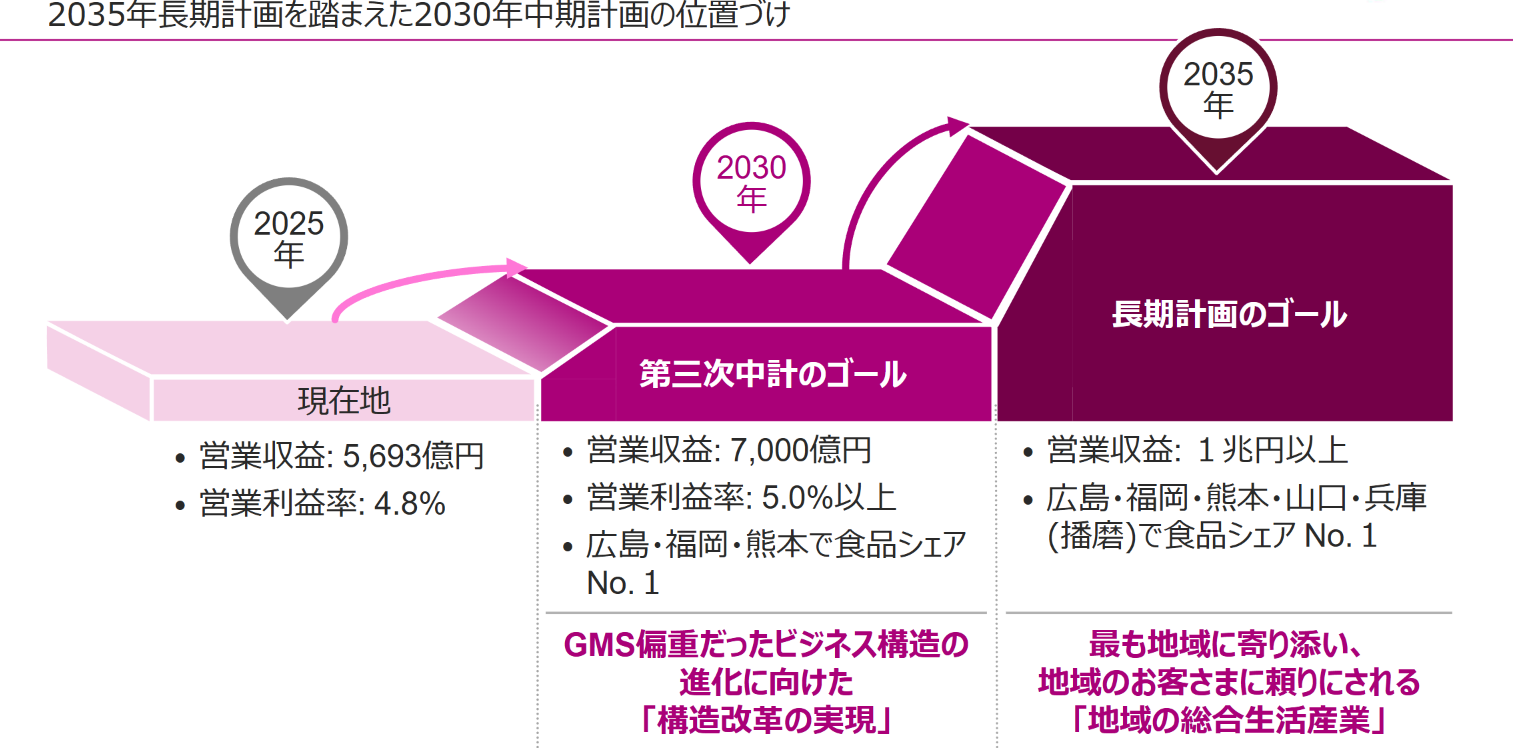具体的には、2030年までに営業収益 7000億円、営業利益率 5.0%以上、300店以上を目指し、「広島・福岡・熊本で食品シェアNo.1となること」「これまでGMS偏重だったビジネス構造の進化に向けた構造改革を実現する」などの方向性を明らかにしている。