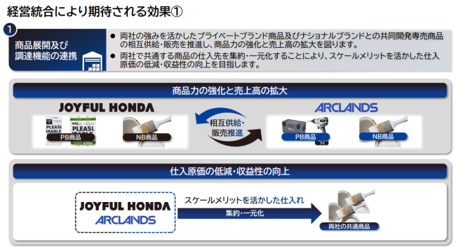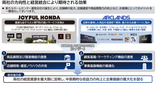 アークランズはホームセンターを中核に、リフォーム、ペット、アート&クラフト、外食、卸売、不動産など幅広い事業を展開していて、生活価値の提供を強化してきた。ジョイフル本田との統合により、商品開発力や大型店運営ノウハウ、専門店運営力を融合し、売場の専門性強化やサービス向上を図る。