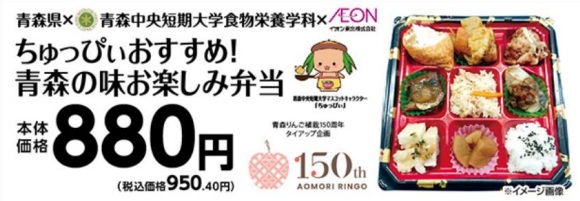 イオン東北(株)(秋田県秋田市、辻雅信社長)は10月11日(土)~10月13日(月・祝)、青森中央短期大学 食物栄養学科の学生と共同開発した「ちゅっぴぃおすすめ!青森の味お楽しみ弁当」(本体価格880円)を、青森県内の「イオン」「イオンスタイル」「マックスバリュ」「イオンスーパーセンター」合計24店舗で販売する。